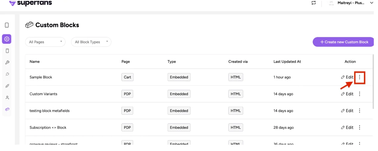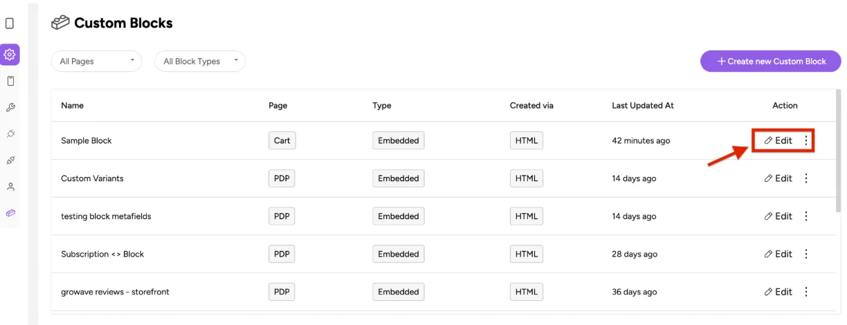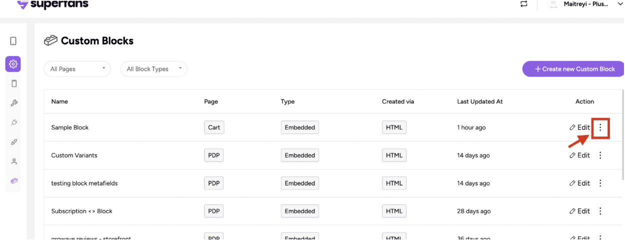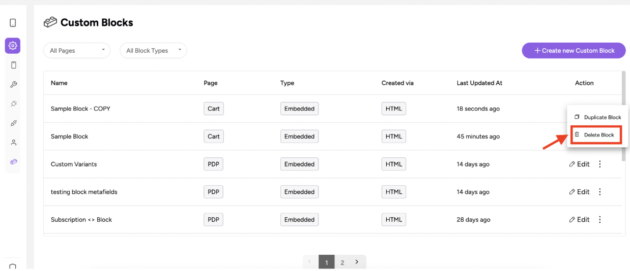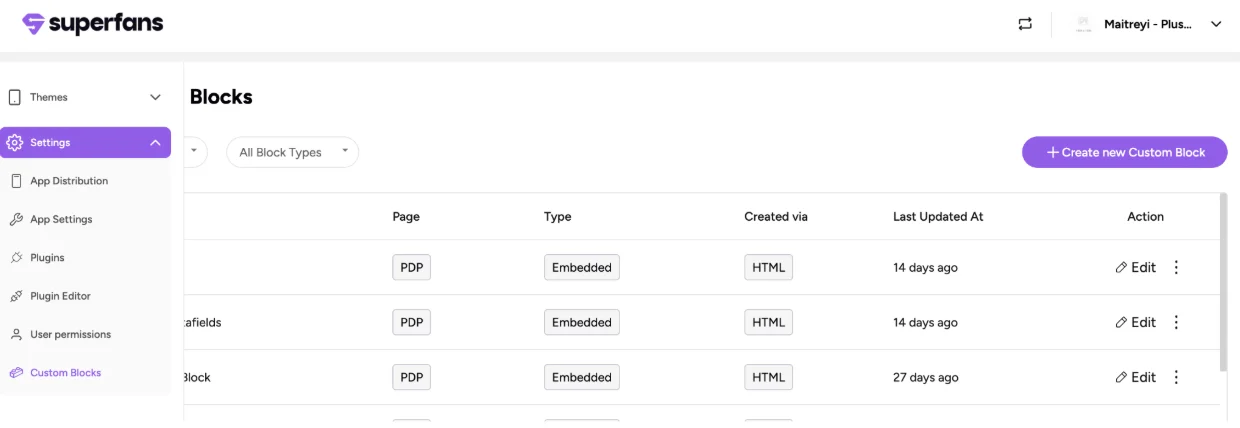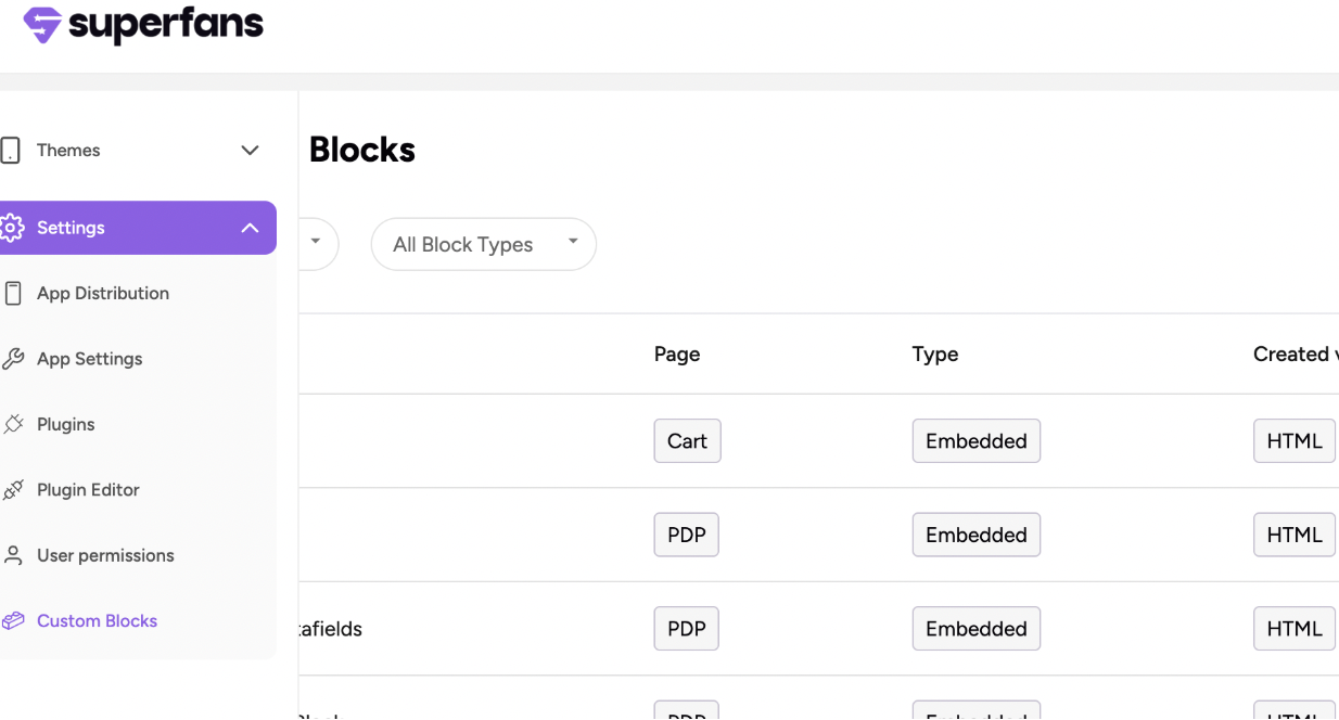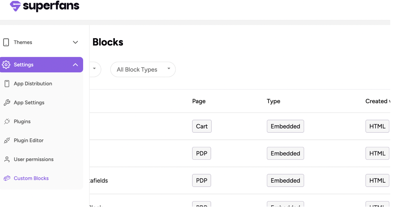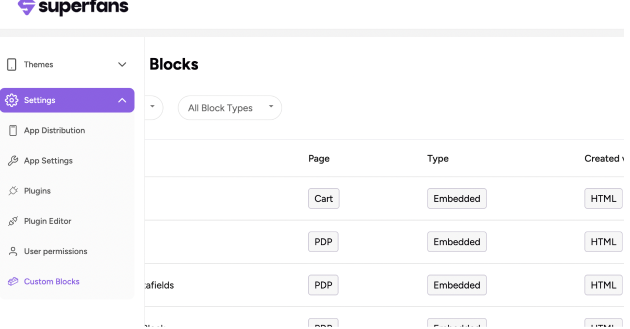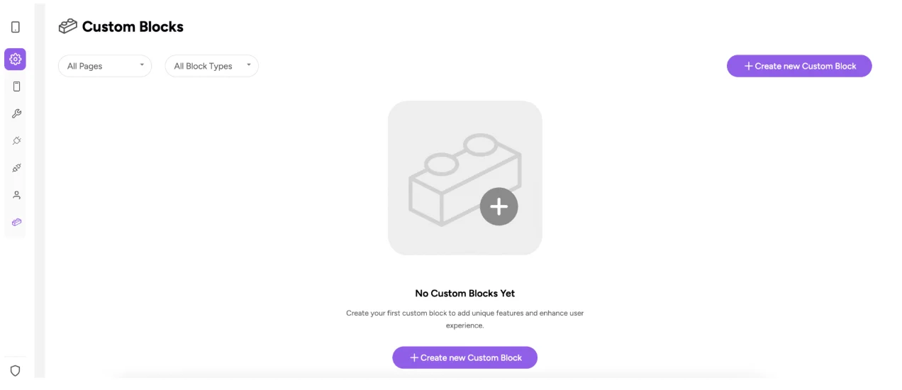 - Navigate to the Custom Blocks section of the dashboard from the Settings menu on the sidebar.