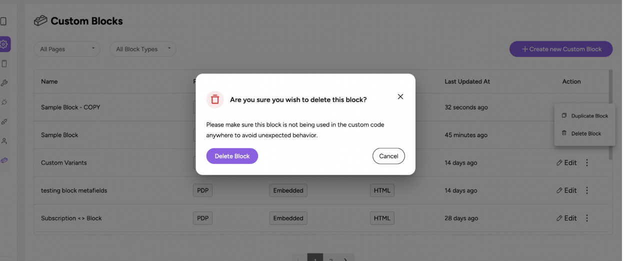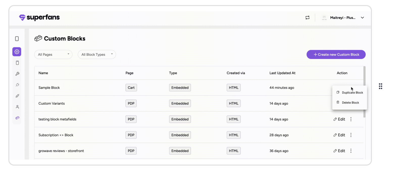 Superfans allows you to edit, duplicate, and delete custom blocks for maximum control and flexibility.