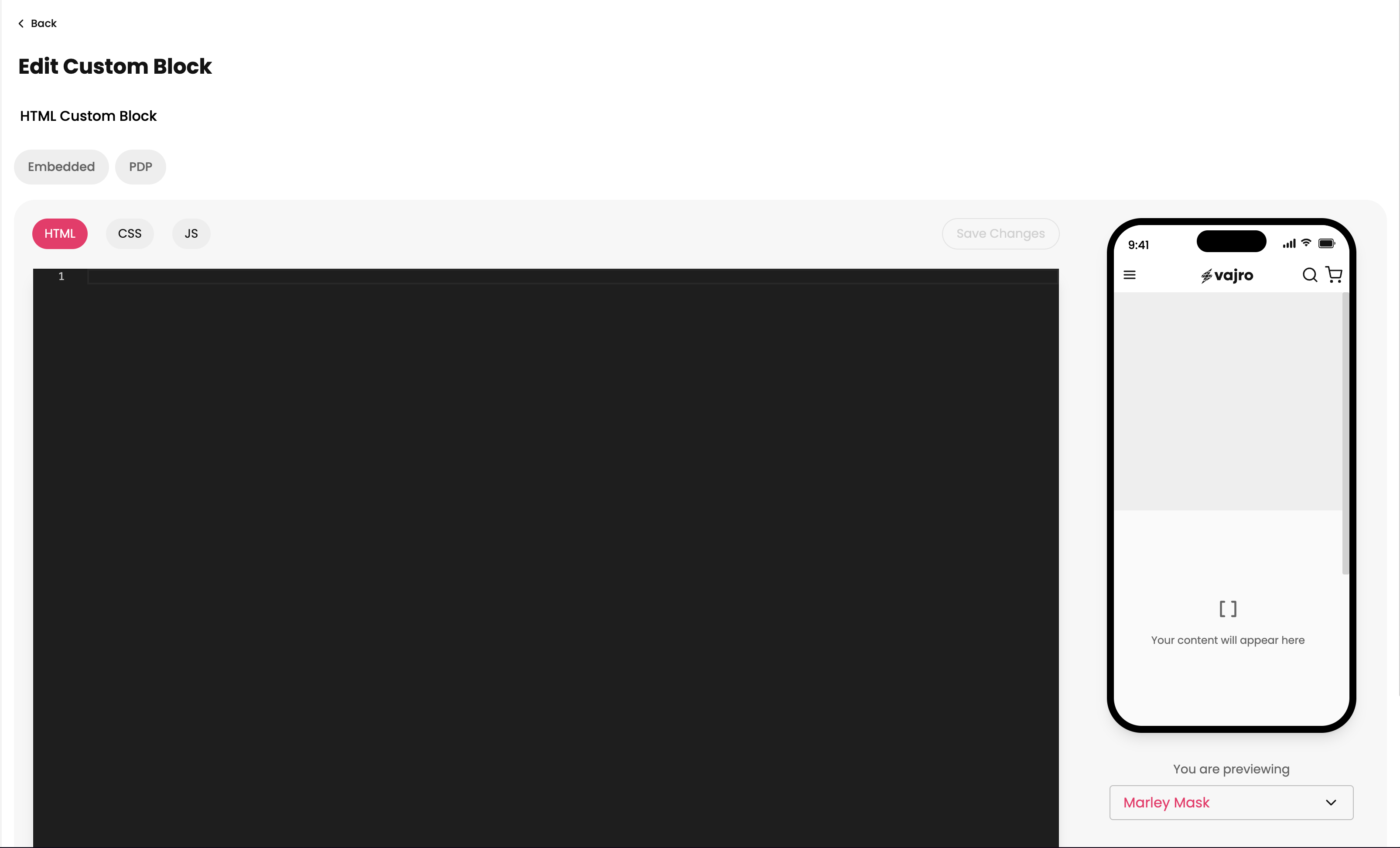 Once you have the block created, you can edit the HTML, CSS and JS to create your custom blocks with the power of VajroSDK for you native app Interactions