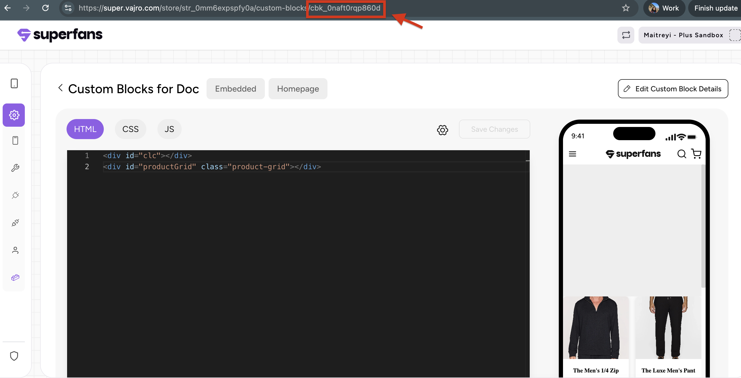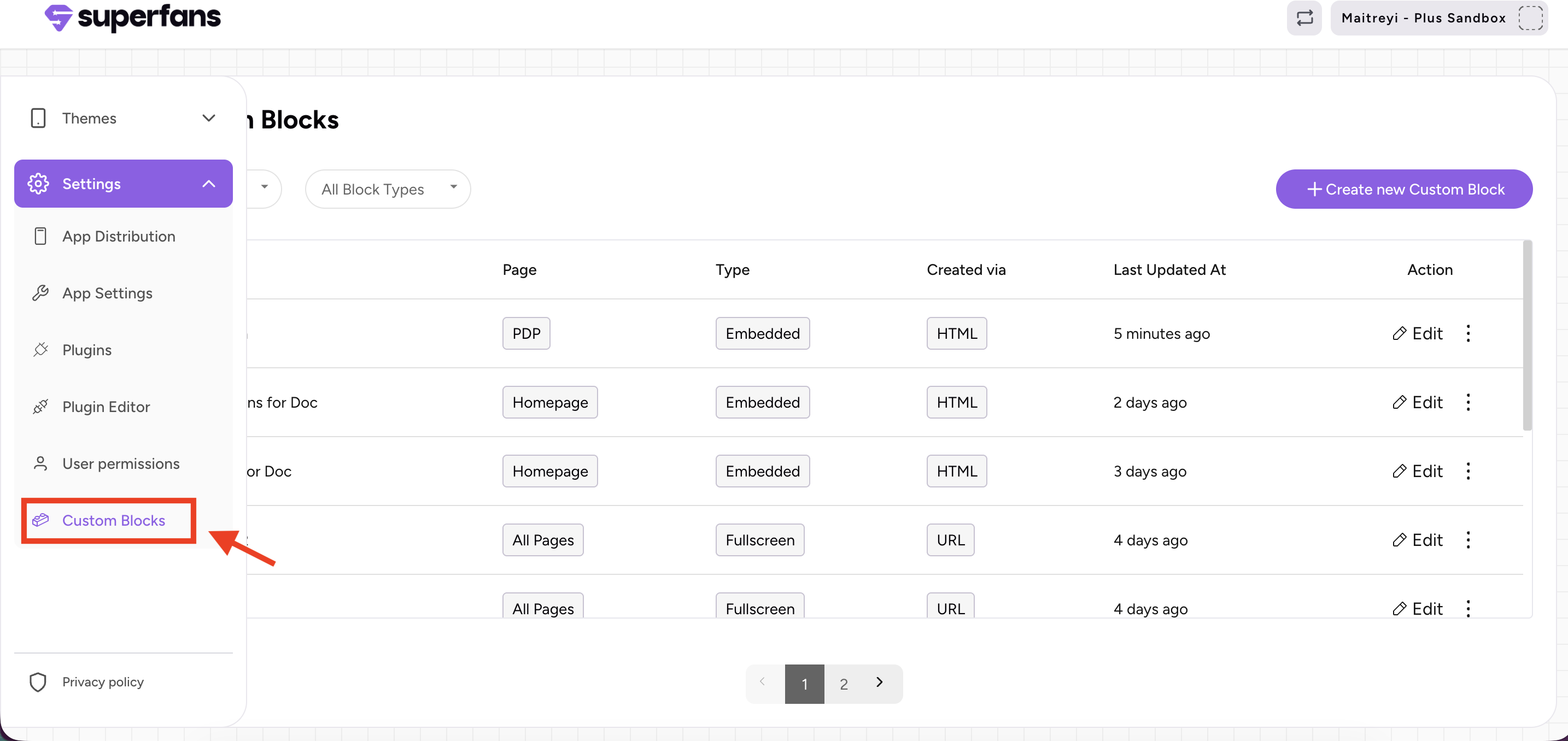 Step 1: Navigate to the Custom Block section in the Superfans dashboard and select the custom block you want to open through code.